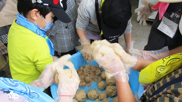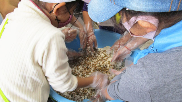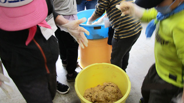 さて本題の味噌造りですが、お二人は力を合わせ「おいしくなーれ! おいしくなーれ!」と念じ、心を込めて混ぜたりこねたりしていました。