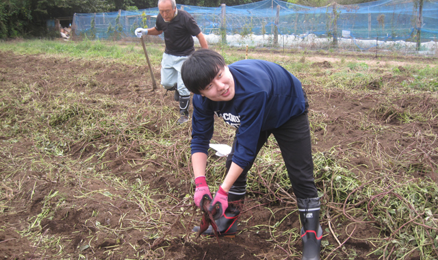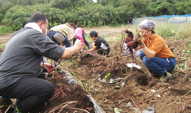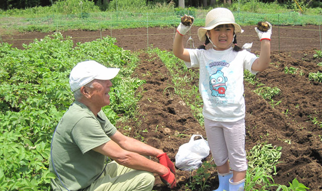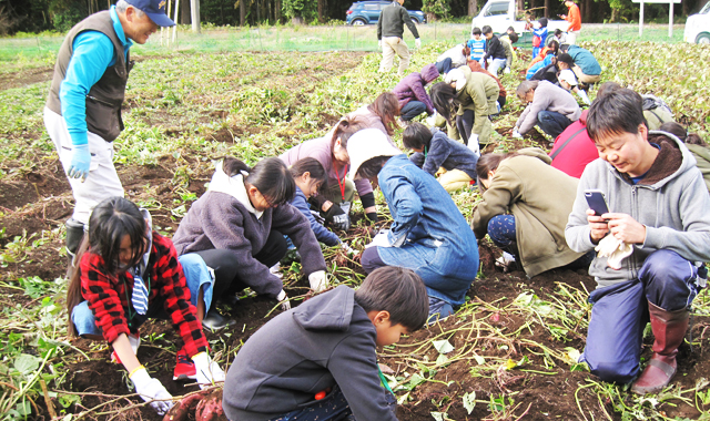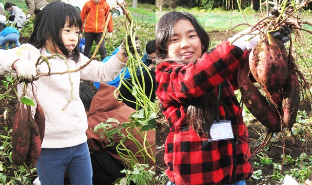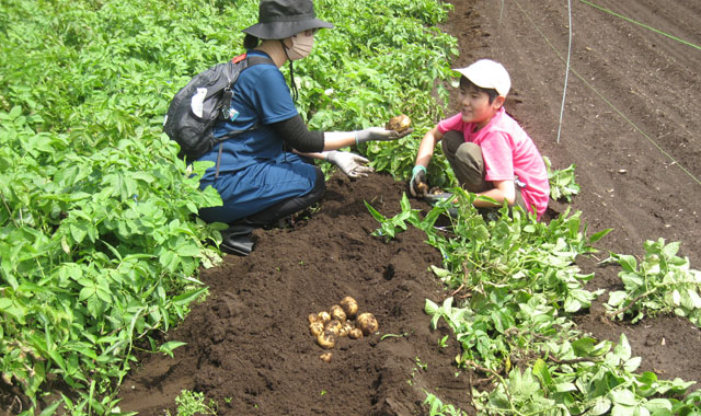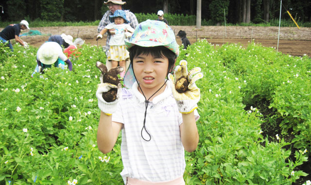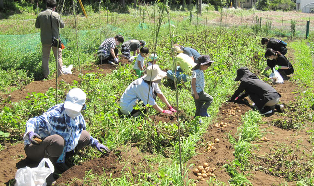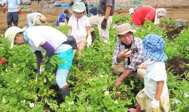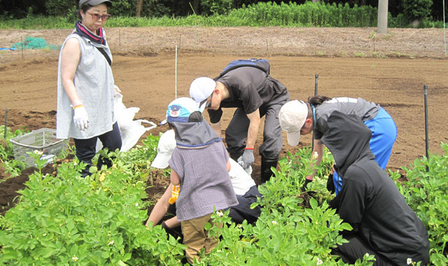 皆さんは、久しぶりの土の感触を楽しみ、会話も弾むなか、家族で力を合わせ、大きく育ったジャガイモを掘り出していました。