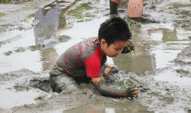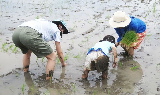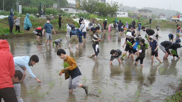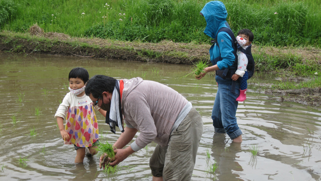 - あいにくの空模様でしたが、親子で泥んこになりながら 頑張って苗を植え付けました。田植えは楽しかったそうで、皆さんとっても良い表情をされていました。