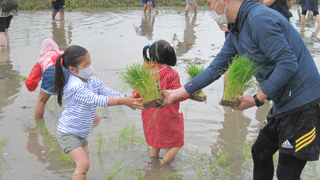 雨のため、乗用田植え機での田植え体験は出来ませんでしたが、皆さんが頑張って植え付けた苗が生育し黄金色に実りましたら、皆さんと刈り取りを楽しみたいですね(コロナの感染拡大状況によりますが)。秋空の下で、額に汗しての稲刈りも楽しいですよ!