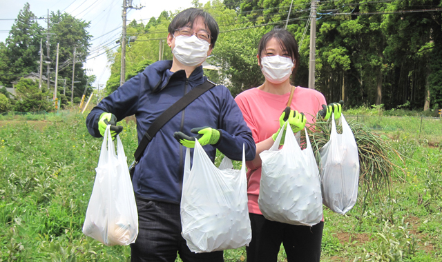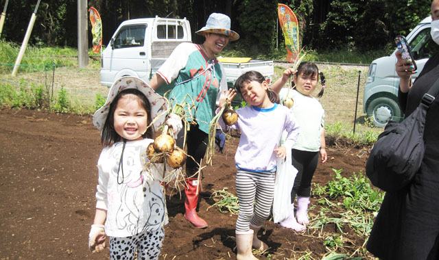 皆さんは、袋いっぱいに詰めた“紅あずま”と“おおまさりネオ”に思いもよらないネギの『おまけ』を重そうに持ち、満面の笑みで体験農場を後にして帰路につきました。