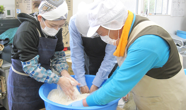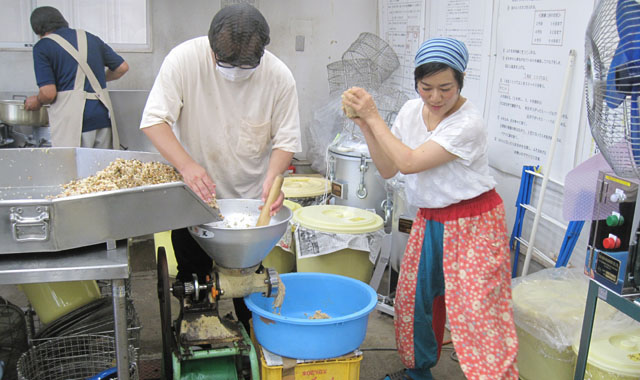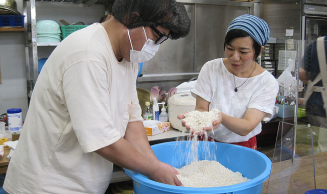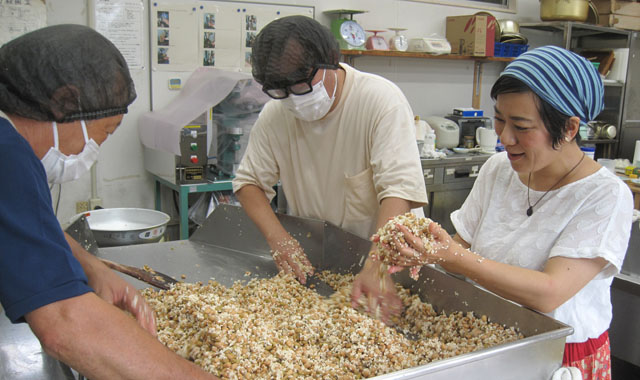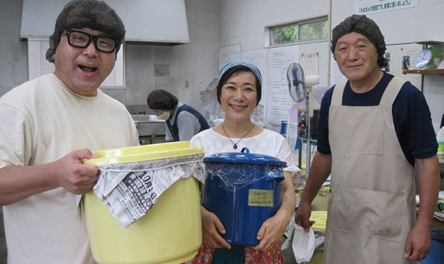 仕込み後のお二人の感想は、「楽しかった! とにかく楽しかった。」そうです。米麹と塩を混ぜ合わせる時の温もりや手の感触に加え、しっとりと甘い大豆から湯気が立ちのぼる際の大豆のふくよかな香りは、想像していたものとは違い、何とも言いようのない感動を覚えたそうです。