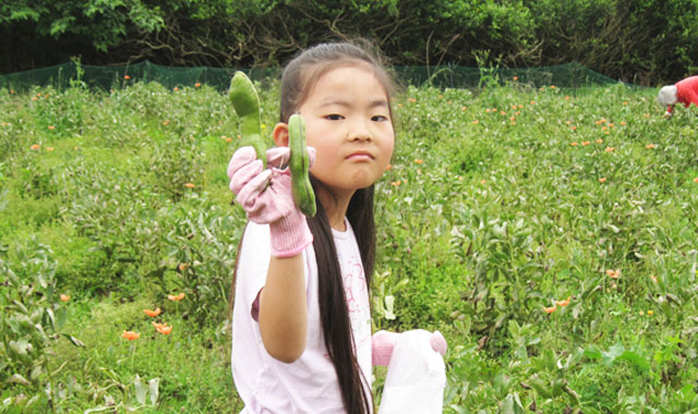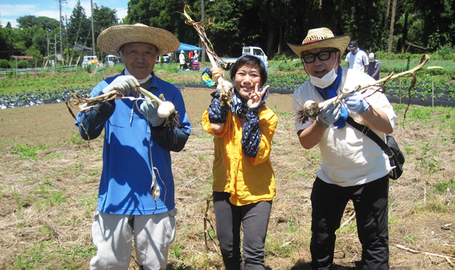 ところで肝心な収穫体験ですが、皆さんレジ袋から溢れんばかりの“きたあかり”と柔らかな“つるなしインゲン”に、何と、直径10cm以上のジャンボな“ニンニク”を両手に重そうに下げて、「野菜が高いから助かる」とか「国産のニンニクは高くて手が出ないわ」などと話しながら、本当に嬉しそうにながらグリーンツーリズム体験農場を後にしていました。