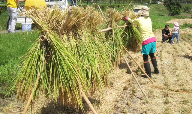 ながらグリーンツーリズムでは、たわわに実った稲を刈り取り、八の字に束ねて小田に掛ける『小田掛 け』も体験して頂こうと準備をしていましたが、この猛烈で殺人的な暑さでは、田んぼからの照り返しも強烈で、長時間田んぼでの作業は危険と判断し、『小田掛け』体験は残念ですが中止としました。