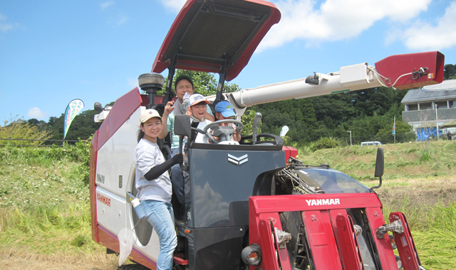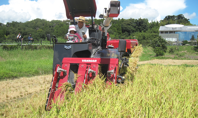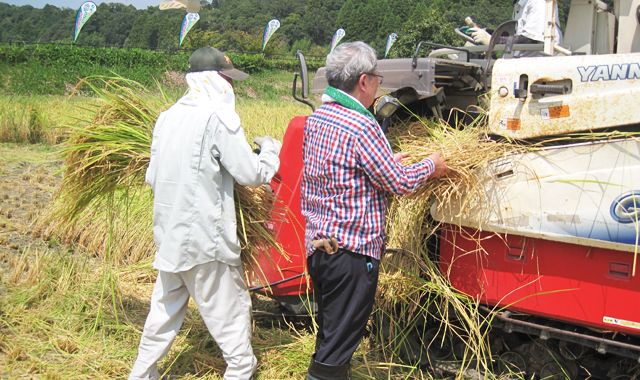 早々に切り上げ、町役場のロビーやテントに入って暑さを凌ぐご家族も見受けられましたが、横浜からご参加の牧野さんご夫妻は、刈り取った稲を八の字に束ねる(小田に掛ける前の作業)体験をしていました。また、コンバインで脱穀もしてみたいと、汗びっしょりになりながらコンバインに刈り取った稲を差し込んでいました。なお、脱穀の後コンバインにも乗車されたそうです(大変お暑いのにお疲れさまでした)。