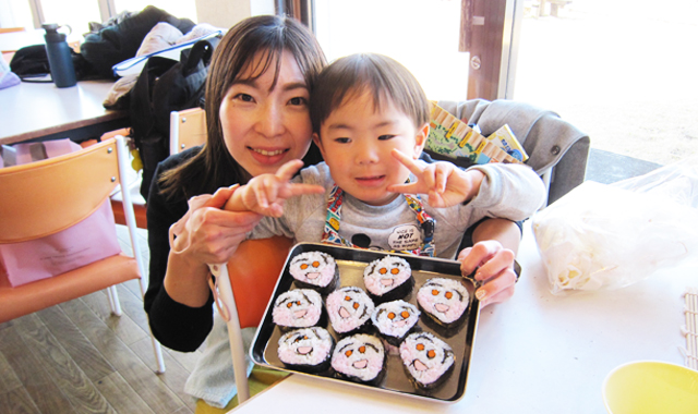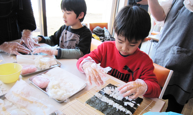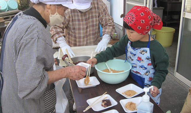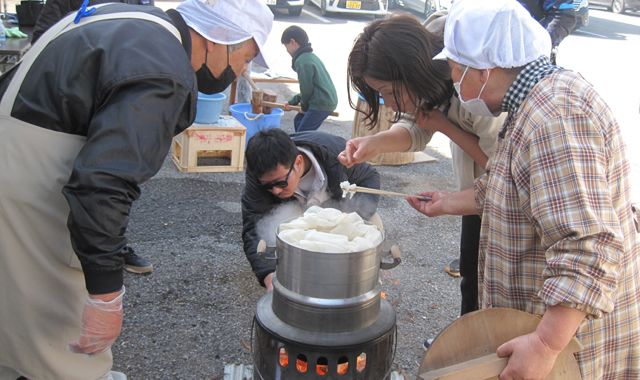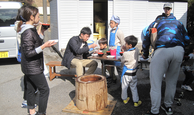 皆さんがコラボして餅つきを楽しみ、つきたての餅や味噌汁を存分に味わったご家族からは、「あまりにも味噌汁が美味しかったので」と味噌造り体験や麹造り体験に、太巻き花寿司巻き体験などの予約をされてお帰りになられる方達もいらっしゃいました。