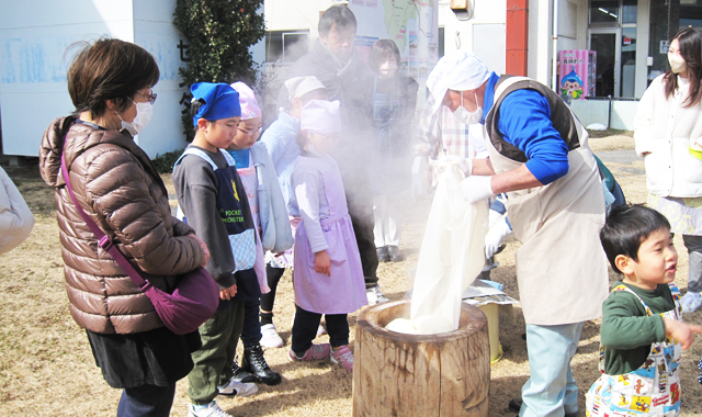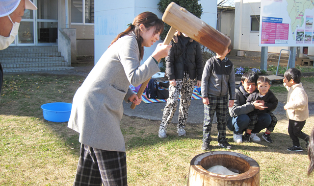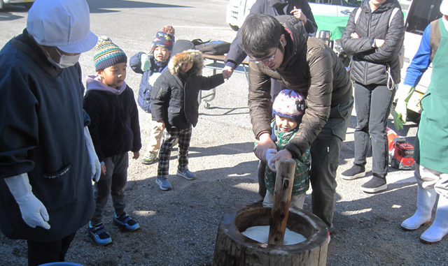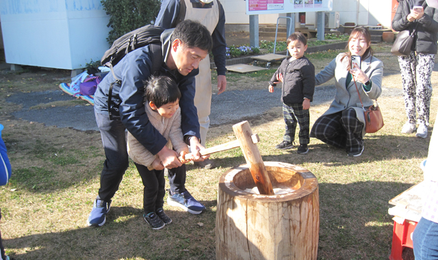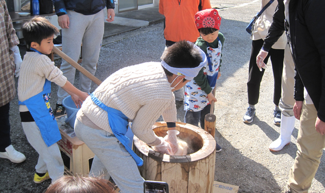 - 4家族、 親子連れの皆さんがコラボして 杵と臼でつく餅つきを楽しみ、つきたてのお餅を存分に味わいました。