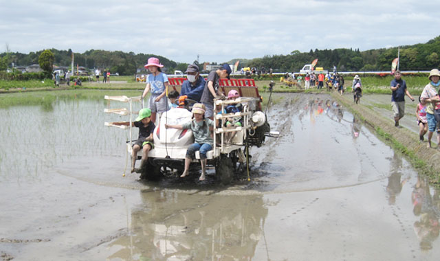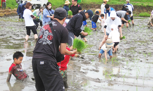 なかには田んぼに座り込んで田植えをするお子さんや「カエルがいた!」と追いかけるお子さんもいて、皆さんはいかにも楽しげに植え付けをしていました。