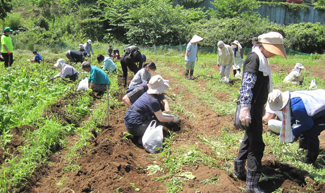 西日本の梅雨明けから話がそれてしまいましたが、グリーンツーリズム体験農園にも夏の太陽がギラギラと照り付け、梅雨明けを思わせる猛暑日となりましたが、千葉や木更津、市原方面からご家族、ご夫妻にお友達同士の皆さんに大勢ご参加頂き、ジャガイモ“とうや”の収穫を行いました。