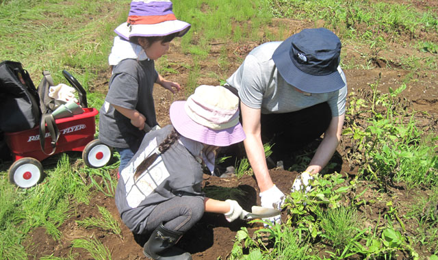田んぼには生き物がいっぱいいます。お子さん達は、田植え前から水路や田んぼで、カエルやザリガニなどを観察したり、捕まえたりに夢中で、「ママ、カエルを捕まえたよ!」と歓声をあげていました。