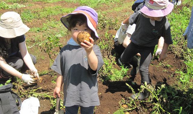 - コロナ禍の「自粛疲れを吹き飛ばせ!」とばかりに、土の感触を楽しみ。元気いっぱいジャガイモを掘りました。