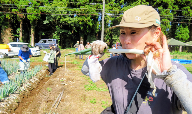 「長柄のネギは甘くて美味しい」と聞いた女性の方は、早速掘ったばかりの生ネギをかじって「甘いけど、やっぱり辛さがくるわ!」とのご感想でした。