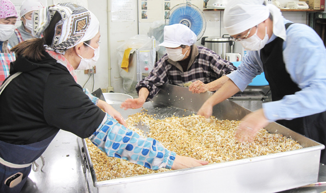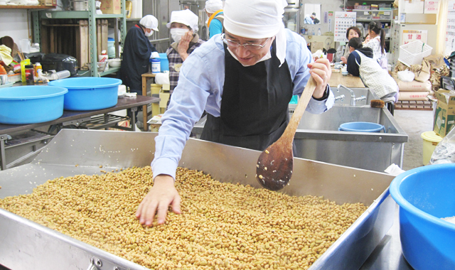 お二人が、煮あがったばかりの大豆をつまみ食いしての感想は、「甘くねっとりとしてとっても美味しい!」と、満面の笑みで話していました。