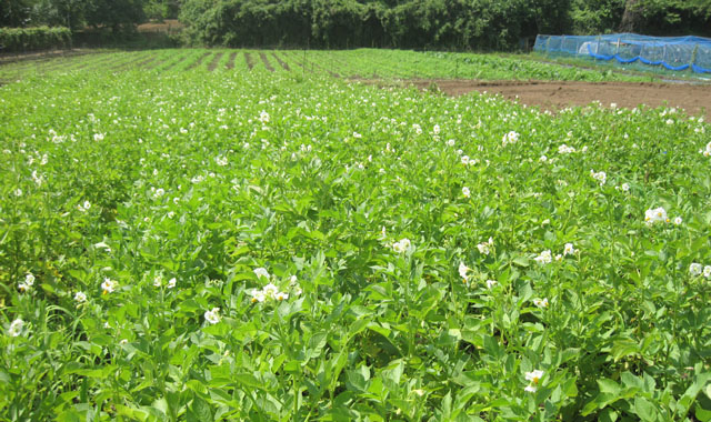 ところで、ながらグリーンツーリズムの体験農園でも、なんと、『ジャガイモの花が咲き続ける』異変が起きています。例年ですと、ジャガイモの花はとっくに咲き終わり、大きなジャガイモの果実をつけますが、何と今年は花が咲き続けています。岡部会長は「花が終わらないのは天候のせいかも・・・」と首をかしげていました(ジャガイモは、品種や栽培地、栽培条件などにより異なりますが、種芋を植え付けてから収穫まで100日程度が目安と言われています。通常花が咲くのは植え付けから50日頃と言われます)。